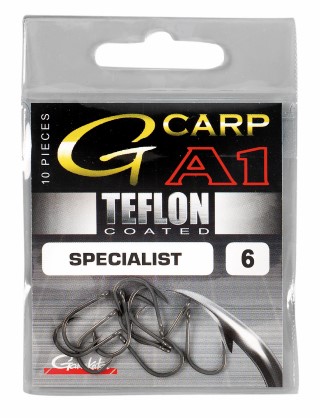 Karperhaken in maat 6 tot 10. De meeste penvissers gebruiken kortstelige haken met een klauwpunt.
