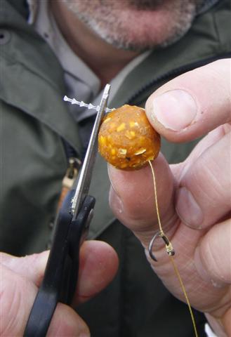 Steek de boilienaald door de boilie en sla het lusje van de hair om de weerhaak van de naald.