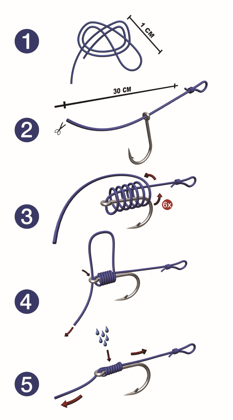 - Schuif de wikkelingen mooi strak tegen elkaar aan en steek het uiteinde van de onderlijn nu in tegengestelde richting door het haakoog.