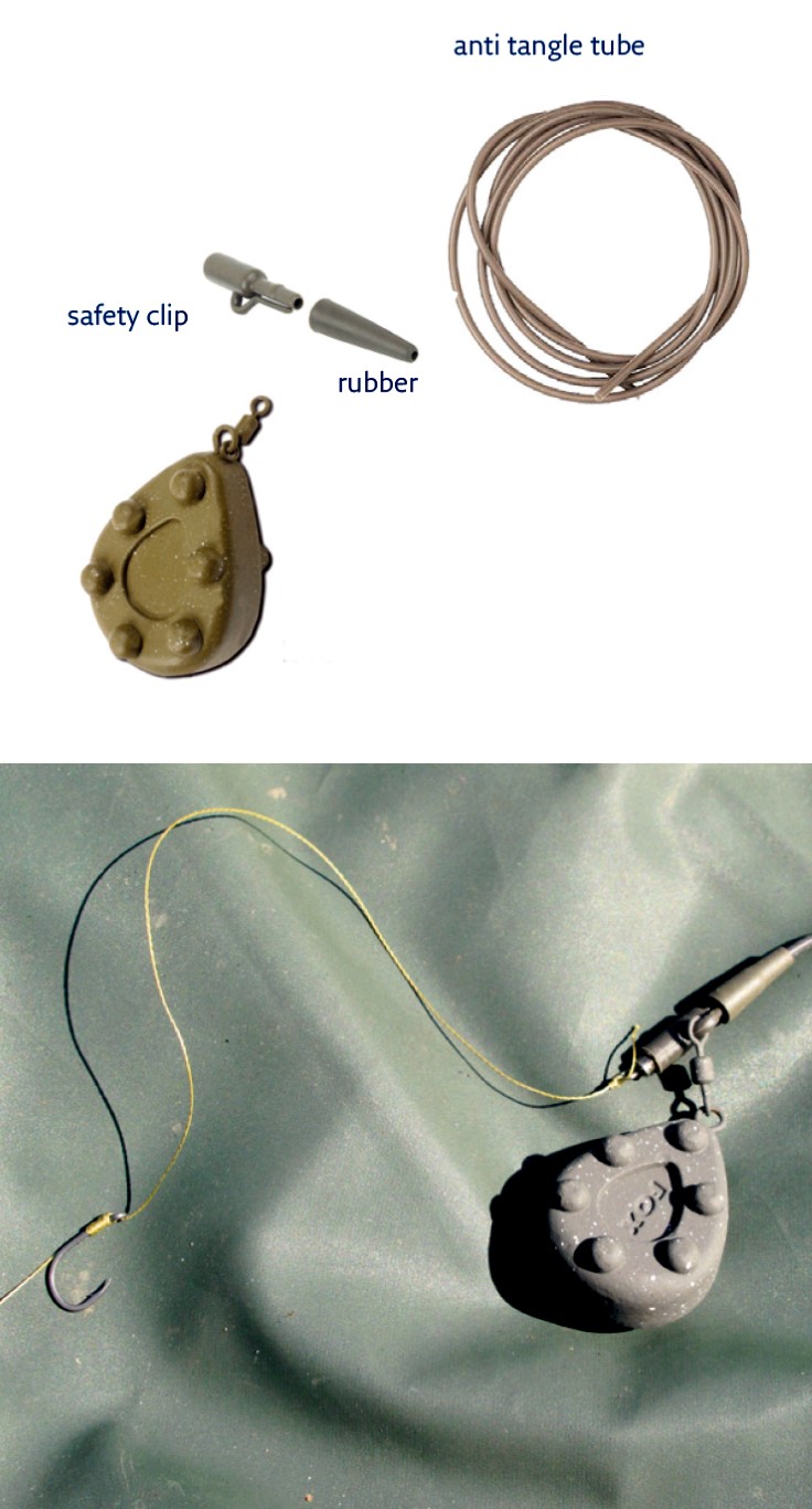 Je kunt een zelfhaaksysteem vrij eenvoudig zelf maken. Een veel gebruikte manier is om de hoofdlijn eerst door een circa 40 cm lang stuk anti tangle tube te schuiven, waarna je een taps rubbertje en een zogenaamde safety clip op de lijn schuift. In deze clip bevestig je het werpgewicht.