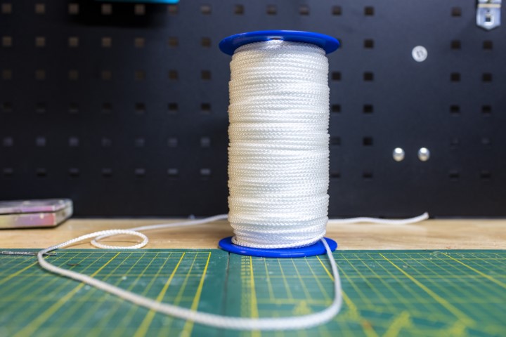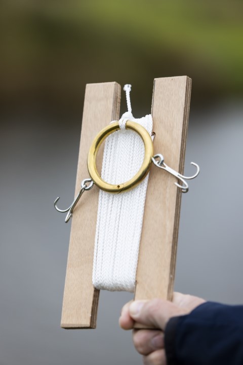 Koop ook een zeiltouw van tien tot vijftien meter lang bij een dikte van 0,5 tot 1 centimeter. Kies voor een hoge kwaliteit zodat het touw niet gaat rafelen. Schaf ook grote zoutwaterdreggen aan (deze zijn extra sterk) in maat 4/0 én een handvol RVS schroefhaken. Maak ook alvast van een plankje of ander materiaal een wikkelrekje voor het touw.