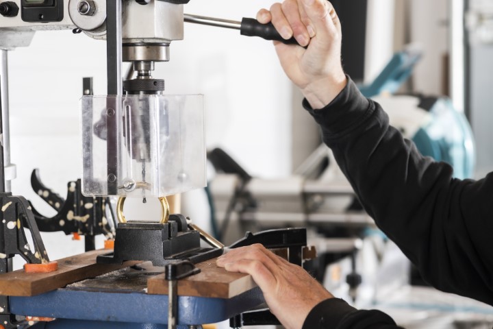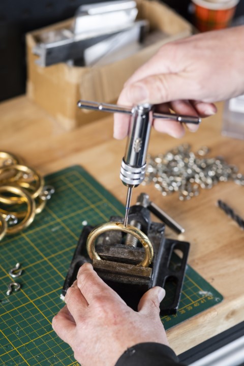 Zet de ring klemvast in een bankschroef en maak met behulp van een professionele ijzerboor vanaf de zijkant twee gaatjes in de ring in dezelfde diameter als de schroefhaken, bij voorkeur op 10 uur en 2 uur ten opzichte van het bevestigingspunt voor het touw.