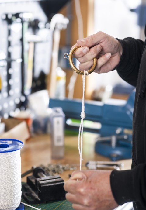 Bevestig het touw aan de ring met een supersterke knoop die zichzelf aantrekt, bijvoorbeeld de bloedknoop. Dit zodat je de knoop nooit lostrekt bij gebruik.