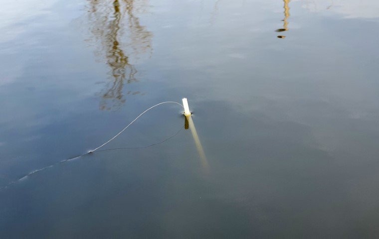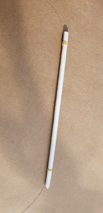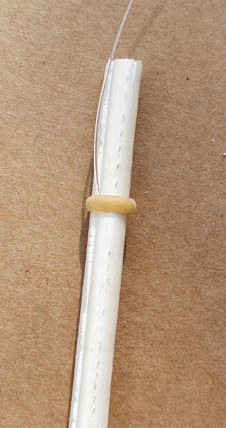 Als de dobber klaar is wil je hem natuurlijk zo snel mogelijk testen, dus pak je hengel erbij! Om de pen op de lijn te zetten begin je met het stukje ventielslang aan de bovenkant van de pen. Daar zet je met je vingers de lijn tegenaan, waarna je met de vingers van je andere hand het ringetje er overheen schuift. Het stukje ventielslang zal oprollen, waardoor het eenvoudig gaat.