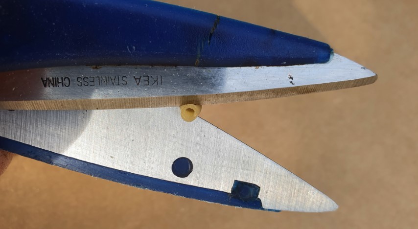 5. Schuif de stukjes ventielslang op de boven- en onderkant van de dobber. Dankzij de schuine uiteinden van de pen gaat dat heel eenvoudig.