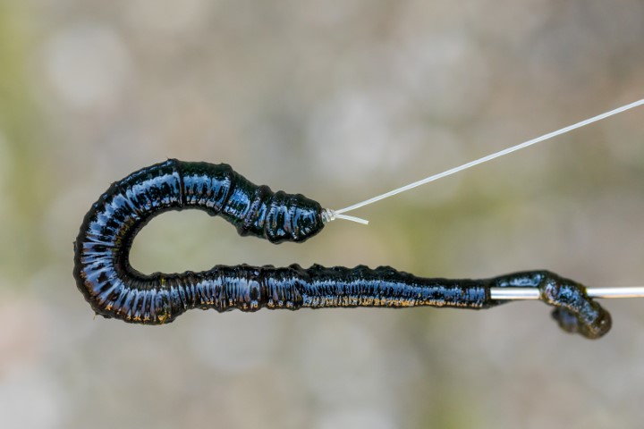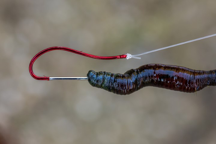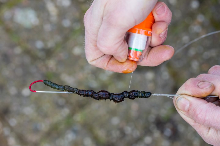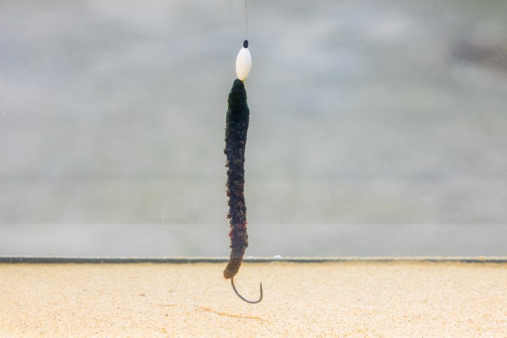 Door het uiteinde van je haakknoop expres wat ruimer af te knippen, houd je een uitsteekseltje over dat je aas ‘vasthoudt’ zodra je het over de haaksteel schuift. Op de foto zit het kopje van de zeepier tegen de knoop, vlak voor het moment waarop hij eroverheen schuift.