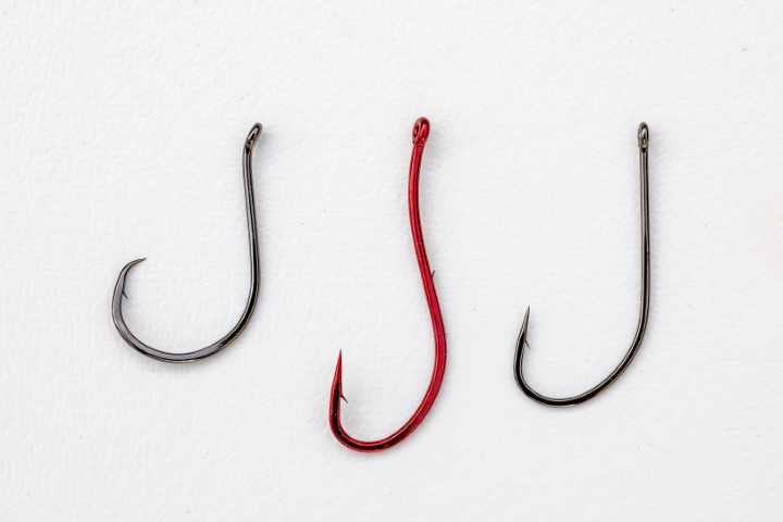Voor het vissen aan de kust zijn grofweg drie haaktypen voorhanden. Naast de standaard zeehaak (rechts, maat 2) lenen haken met een wijde bocht en terugstaande haakpunt (links, maat 1) zich het best voor het vissen met een enkel zager onder een dobber. Het voordeel van dit haaktype is dat de vis zichzelf hiermee al haakt bij de minste of geringste spanning op de lijn – dus zonder dat jij de haak hoeft te zetten. Zogenaamde ‘gezette’ haken (midden, maat 1/0) hebben een betere inhakingskans omdat de haakpunt ervan iets uit het lood staat. Het rode exemplaar op de foto heeft bovendien een klein weerhaakje op de steel waardoor het aas beter blijft zitten. Voor welk type haak je ook kiest: wees er zeker van dat ze scherp zijn en ga gerust voor een fors exemplaar, want zeevissen zijn niet vies van een flinke hap.