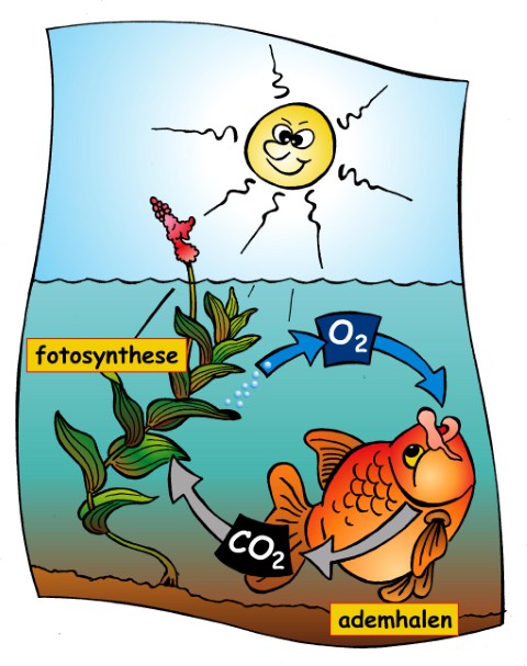 Net als mensen ademen vissen zuurstof in en koolstofdioxide (CO2) uit. Die CO2 is niet zomaar afval: waterplanten gebruiken het juist! Dankzij zonlicht zetten planten die CO2 om in verse zuurstof. Dat heet fotosynthese.