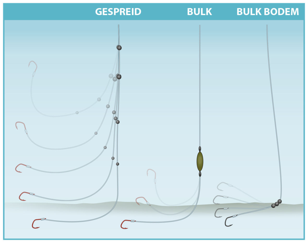 - Langere onderlijn (50 cm+) geeft trager zinkend aas maar minder beetregistratie.