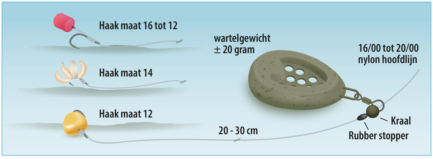 - Gebruik een klein wartelgewicht of lichte voerkorf.