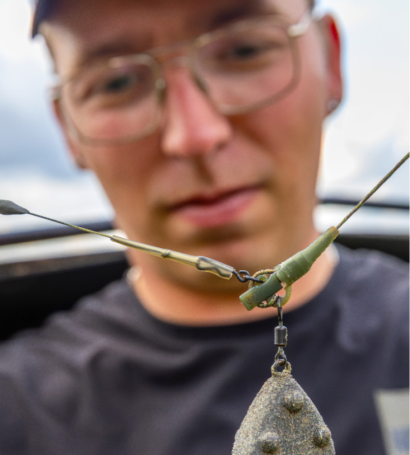Als karpervisser zorg je goed voor de vis. Dat begint met een grote, dikke onthaakmat en een zorgvuldige omgang met de vis, maar gaat verder. Mike: “Een visveilig systeem is cruciaal, vooral bij zelfhaakmontages. Dit zorgt ervoor dat de karper bij lijnbreuk niet met het gewicht, leader en meters hoofdlijn blijft zitten, maar enkel de onderlijn (tijdelijk) bij zich draagt.”