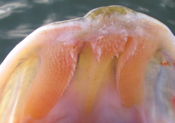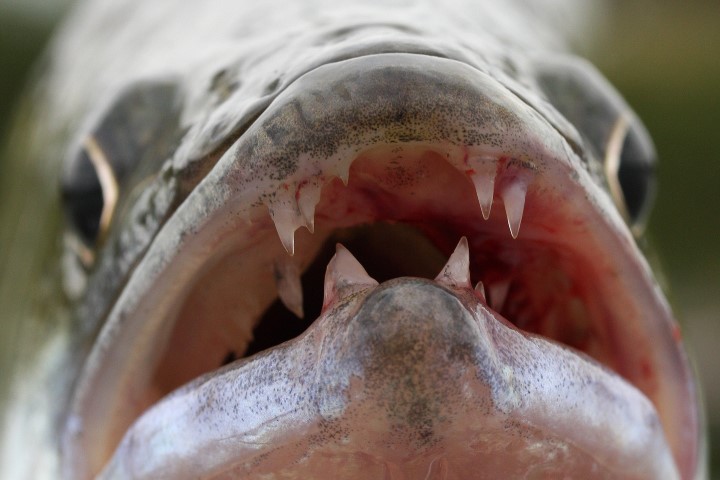 Close-up van een snoekenbek. Je ziet hier een stuk of 500 vlijmscherpe tanden. Je begrijpt nu waarom je altijd een stevige onderlijn moet gebruiken. En waarom je niet zomaar je hand in de bek moet steken...