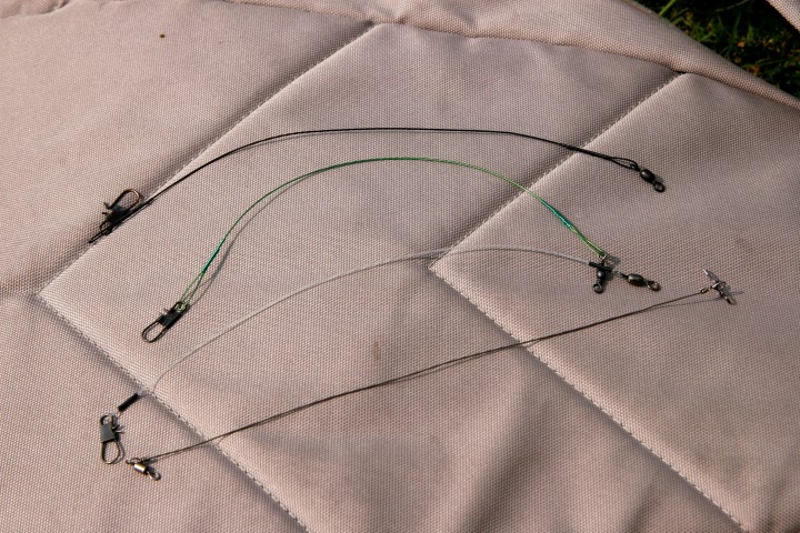 Hier zie je vier soorten onderlijnen, van boven naar onder: zwarte en groene standaard stalen onderlijn (goed voor alle situaties), dikke fluorcarbon onderlijn (voor kraakhelder water en schuwe vis) en een spinstang (specifiek voor pluggen zonder zwemlip, zogenaamde jerkbaits). Gebruik bij voorkeur onderlijnen van minimaal 30 centimeter lang. Zo voorkom je dat je hoofdlijn wordt doorgebeten.