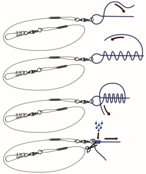 4. Nu de hele knoop voorzichtig aantrekken, richting de wartel. De stalen onderlijn zit nu muurvast.