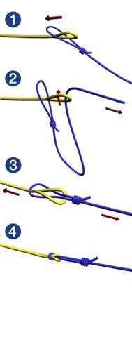 - De uiteindelijke lus-in-lus knoop is sterk, maar kan snel worden los gehaald als je van leader wilt wisselen.