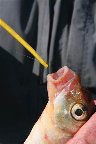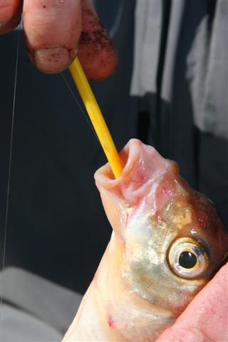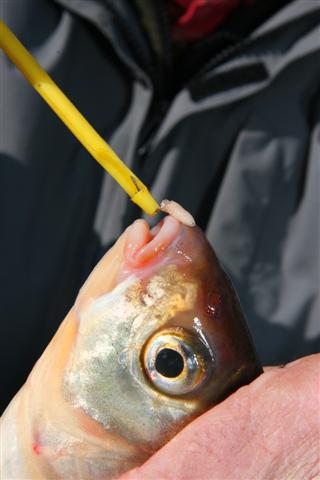 Zodra het haakje vrij is haal je de hakensteker uit de bek en kun je de vis weer terugzetten. Knip bij een diep geslikte haak altijd de lijn door.